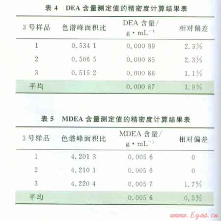 由表4和表5可以看出DEA含量測定值的相對偏差是1.9%,MDEA含量測定值的相對偏差是0.5%,表明該方法精密度較高。