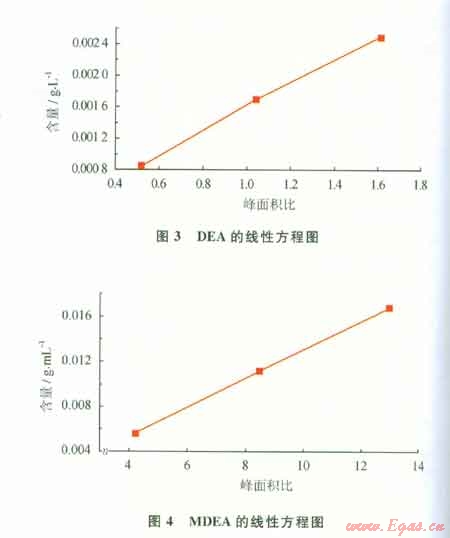使用Microcal orign 5.0繪圖軟件進行數(shù)據(jù)處理。以DEA、MDEA的峰面積與TEG的峰面積的比值為橫坐標,以標準樣品含量為縱坐標作圖,得到線性方程(圖3、4),從而得到各自的標準曲線。