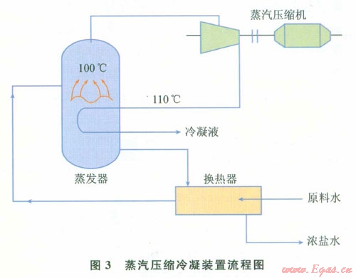 蒸汽壓縮冷凝脫鹽技術(shù)是將鹽水預(yù)熱后,引入蒸發(fā)器并使之在蒸發(fā)器內(nèi)部分蒸發(fā)。蒸汽壓縮冷凝裝置流程如圖3所示,流程所產(chǎn)生的二次蒸汽經(jīng)壓縮機壓縮提高壓力后引入到蒸發(fā)器的加熱側(cè),蒸汽冷凝后作為完成液引出,如此實現(xiàn)熱能的循環(huán)利用。蒸汽壓縮冷凝方法可使冷卻水中的有害成分得到濃縮排放,并使冷凝液作為循環(huán)水和鍋爐補充水返回系統(tǒng),同時將低能量的蒸汽轉(zhuǎn)化為高能量的蒸汽用于后面裝置的加熱。單個蒸汽壓縮裝置的處理能力為250~3 000m3/d。