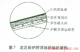 在運行過程中,由于高爐煤氣的產(chǎn)量不穩(wěn)定,壓力較低,燃燒器出現(xiàn)數(shù)次熄火。不久,現(xiàn)場運行人員在爐膛頂部爐墻發(fā)現(xiàn)幾處裂縫?,F(xiàn)場檢查后發(fā)現(xiàn),爐膛頂部的包墻管為單根光管結(jié)構(gòu),耐火層采用異形耐火磚敷設(shè),絕熱層采用輕質(zhì)保溫磚,最外層用石棉泥抹面密封,改造前爐膛頂部爐墻的結(jié)構(gòu)見圖2。