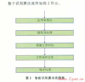 紅外熱像儀采集的圖像首先使用圖像預(yù)處理算法(包括中值濾波、目標(biāo)分割等)將圖像中的噪聲和背景信息去掉。被預(yù)處理后的圖像只保留了含有溫度梯度變化的部分目標(biāo)圖像。使用智能識別算法對圖像進(jìn)行識別,計(jì)算出液體的含量。