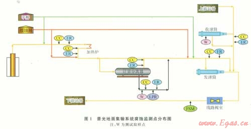 針對(duì)普光氣田地面集輸工藝及各種監(jiān)測技術(shù)的特點(diǎn),在集氣站和集氣總站設(shè)置水分析取樣點(diǎn),采用腐蝕掛片法(CC)、電阻探針法(ER)、線性極化探針法(LPR)、定期進(jìn)行鐵離子分析等方法,在集輸管網(wǎng)的線路管道上采用FSM電指紋方法進(jìn)行腐蝕監(jiān)測。