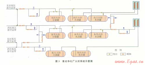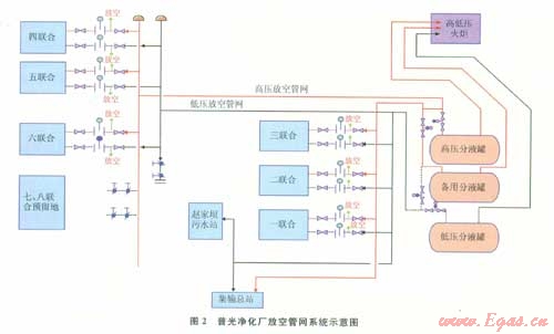 放空管網(wǎng)系統(tǒng)包括從各系列天然氣凈化裝置內(nèi)的放空閥后至高低壓放空分液罐的部分。每系列裝置管廊上的高低壓放空總管經(jīng)位于裝置界區(qū)的高低壓分液罐分離泄放氣中攜帶的脫硫、脫水溶劑后,匯入東西區(qū)高低壓放空管網(wǎng)。東區(qū)高低壓放空管網(wǎng)主要負(fù)責(zé)第一、二、三聯(lián)合天然氣凈化裝置、趙家壩污水站及集氣總站的放空需要,西區(qū)高低壓火炬放空管網(wǎng)主要負(fù)責(zé)第四、五、六聯(lián)合天然氣凈化裝置的放空需要。東西區(qū)高壓放空管網(wǎng)并行進入高壓放空分液系統(tǒng),東西區(qū)低壓放空管網(wǎng)匯合成低壓放空總管后進入低壓放空分液系統(tǒng)。