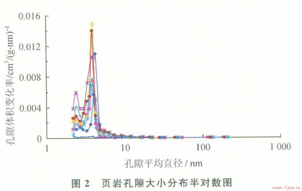 1)所研究頁巖氣藏的孔隙度主要分布在0.5%~5%,滲透率主要分布在0.000 01~10 mD,黏土礦物主要為綠泥石、伊利石、蒙皂石以及伊蒙混層,頁巖的孔隙主要分布在4~6 nm。
