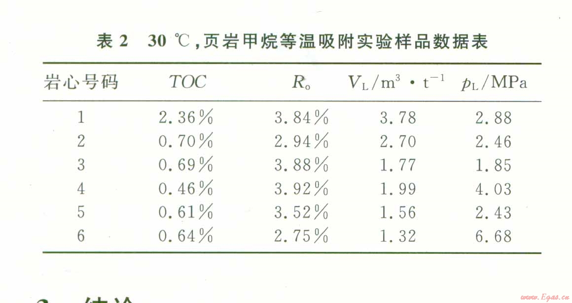 式中K為在壓力P下單位體積儲層里吸附氣的體積,m3/t;V。.為Langmuir體積,表示吸附劑的最大吸附體積,M3/t;P為氣體壓力,MPa;pl,為Langmuir壓力,MPa,此時吸附氣體積(VE)為Langmuir體積的1/2。