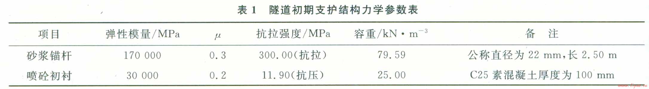 有限元計(jì)算參數(shù)彈性模量(Es)為0.8 GPa,泊松比 為0.4,內(nèi)聚力(C)為0.10 MPa,內(nèi)摩擦角為18°,抗拉強(qiáng)度 為0.30 MPa,彈性抗力系數(shù)為80MPa/m,容重 為17.00 kN/m3。隧道初期支護(hù)結(jié)構(gòu)力學(xué)參數(shù)如表1所示