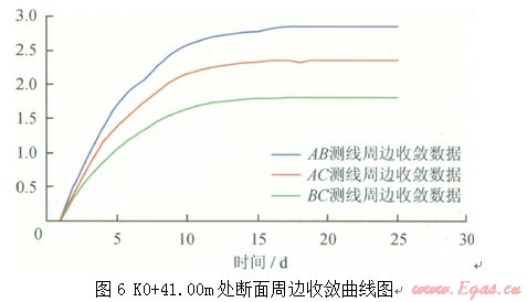在K0+21.00m、K0+31.00m、K0+41.00 m、KO+51.00m這4個(gè)斷面進(jìn)行了隧道周邊收斂觀測,每斷面布置3個(gè)(A、B、C)測點(diǎn),測點(diǎn)布置見圖5。數(shù)據(jù)顯示4個(gè)斷面處的最大收斂值為2.80mm,為跨度的0.15%,滿足規(guī)范規(guī)定的變形控制標(biāo)準(zhǔn),且變形量都呈現(xiàn)前期大,后期逐漸趨緩,最后穩(wěn)定不變的趨勢,其中KO+41.00 m處斷面的周邊收斂曲線如圖6所示。