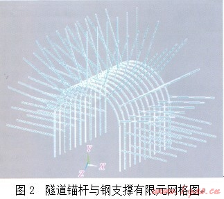 巖體有限元網(wǎng)格見圖1,隧道錨桿與鋼支撐有限元網(wǎng)格見圖2。