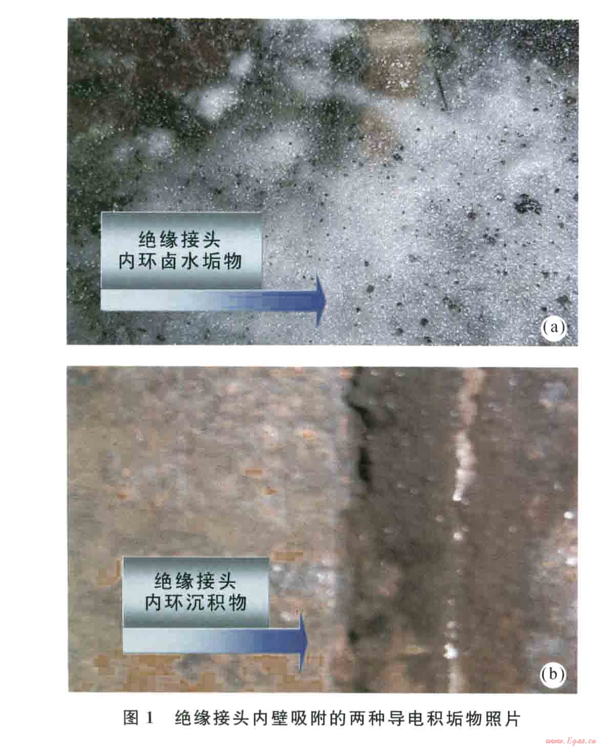 麻金線是一條礦區(qū)進氣管線,由于管道輸送氣質(zhì)中帶有大量鹵水,在管道內(nèi)壁表面形成以晶體鹽為主的積垢物,以及腐蝕產(chǎn)物所形成的積垢物。圖l所見是2008年麻金線在用絕緣接頭割除后絕緣接頭內(nèi)壁形成的積垢物。這些積垢物都屬強導(dǎo)電介質(zhì),它們吸附在絕緣接頭兩端的金屬和絕緣環(huán)上,組成一個完整的電解質(zhì)將絕緣環(huán)兩端的金屬短接,致使大量的極保護電流漏失。