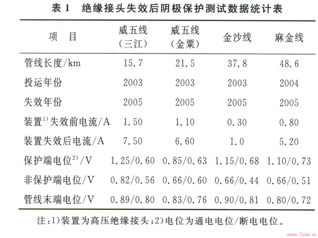 金山輸氣站是麻柳場氣田進氣的集輸站,日輸氣量100×104m3,共有4條輸氣管線,建有l(wèi)座陰極保護站,分別向“威五線(三江)”、“威五線(金粟)”、“麻金線”、“金沙線”4條管線送電,在各條管線的進出站端安裝有絕緣接頭裝置。從表l中可見絕緣接頭失效后陰極保護系統(tǒng)出現(xiàn)的現(xiàn)象。
