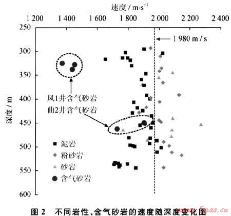 利用波阻抗值來(lái)判別巖性和對(duì)含氣砂巖進(jìn)行判別的一個(gè)重要條件就是不同巖性的速度要具有差異性,因此,本次研究對(duì)盆地內(nèi)兩口氣井(鳳1井和曲2井)茨營(yíng)組三段的巖性和速度特征進(jìn)行分析,其結(jié)果如圖2所示。這兩口井在茨營(yíng)組三段Ⅳ砂組以粉砂巖為主同時(shí)夾有大量泥巖,其整體速度較低,介于1400~2200m/s之間,以1980m/s為界,砂巖和粉砂巖的速度較之泥巖要高,介于1980~2200m/s,而泥巖的速度較低,介于1700~1980m/s,部分粉砂巖和泥巖速度有疊置現(xiàn)象,但整體上仍可以利用速度將砂泥巖區(qū)分開(kāi),從圖中可以看出當(dāng)砂巖中如果含氣的話,其速度則明顯降低,但鳳1井和曲2井含氣砂巖的速度降低程度不同,鳳1井的速度降低較大,為1400m/s左右;曲2井速度降低幅度較小,為1800m/s左右。
