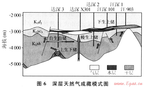 2) 徐家圍子斷陷深層天然氣藏有4種成藏模式,其中烴類氣藏為上生下儲(chǔ)式、自生自儲(chǔ)式、下生上儲(chǔ)式;CO2為幔生上儲(chǔ)式。但主要發(fā)育下生上儲(chǔ)式成藏模式,天然氣沿?cái)嗔岩源瓜蜻\(yùn)移為主。