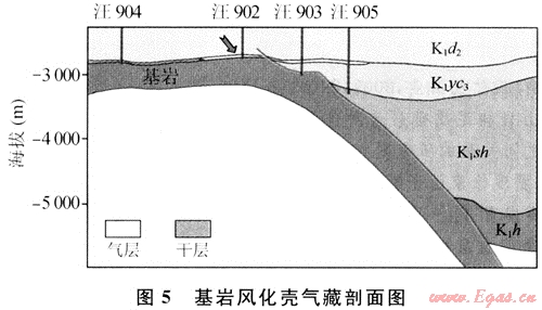 這種氣藏位于不整合面之下基巖頂部,由于基巖被風(fēng)化剝蝕而形成物性較好的儲(chǔ)集空間,天然氣注入形成的天然氣藏?;鶐r風(fēng)化殼氣藏儲(chǔ)層巖性比較復(fù)雜、類型多,主要分布在汪902、肇深1、肇深3、昌401、昌102井。其中,汪902井為基巖動(dòng)力變質(zhì)巖的風(fēng)化殼氣藏;肇深1、肇深3井為基巖花崗巖的風(fēng)化殼氣藏;昌401、昌102井為基巖千枚巖的風(fēng)化殼氣藏,含氣層段達(dá)80m。