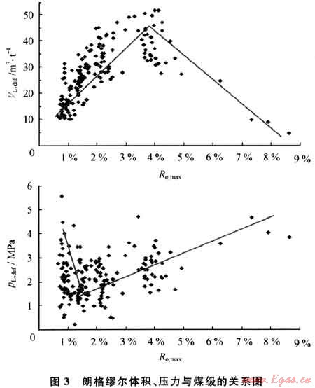180件煤樣(Ro,max介于0.67%~8.61%)在30℃、平衡水條件下的等溫吸附實驗成果表明,朗格繆爾體積(VL,daf)介于4.69%~51.90%,呈現(xiàn)出兩段式變化模式,即煤化程度在Ro,max<4%之前,VL,daf隨Ro,amx的增加而增大,當Ro,max>40后,VL,daf隨Ro,max的增加而減少(圖3);朗格繆爾壓力(pL,daf)介于0.20~5.58MPa,在Ro,max<1.3%之前,pL,daf隨Ro,max的增加而減少,當Ro,max>1.3%后,pL,daf耐隨Ro,max的增加而增大(圖3),但數(shù)據(jù)十分離散。