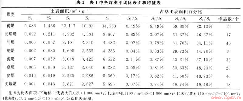 各煤類各孔徑結(jié)構(gòu)中比表面積微孔、過渡孔占絕對多數(shù)(圖2、表2),成為煤層氣吸附的主要場所,大孔均低于0.82%,中孔除褐煤達到6.49%,長焰煤達到2.07%外,其他均低于0.82%(圖2、表2)。