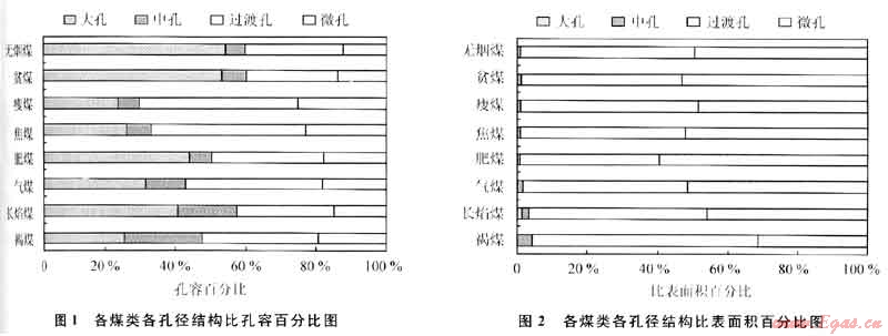 1) 華北地區(qū)褐煤、長焰煤各孔徑結(jié)構(gòu)中比孔容分布較均勻,其他煤類中大孔、過渡孔占較高比例,中孔不發(fā)育;各煤類各孔徑結(jié)構(gòu)中比表面積微孔、過渡孔占絕對多數(shù)。