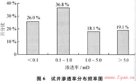超低滲透儲層(滲透率小于0.1mD)占26.0%,低滲透儲層(滲透率介于0.1~1.0mD)占36.8%,中滲透儲層(滲透率介于1.0~5.0mD)占18.1%,高滲透儲層(滲透率大于5.0mD)占19.1%(圖6、表3)。試井滲透率總體隨埋深的增加而減少(圖7)。
