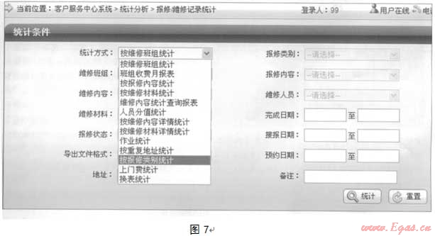 報(bào)修維修統(tǒng)計(jì)內(nèi)容比較多,可生成各類(lèi)統(tǒng)計(jì)報(bào)表,可根據(jù)歷史時(shí)問(wèn)統(tǒng)計(jì)報(bào)修的數(shù)量,同時(shí)支持一些關(guān)鍵篩選,如用戶(hù)報(bào)修,巡線(xiàn)報(bào)修等。維度可以為:維修班組、報(bào)修內(nèi)容、維修內(nèi)容、維修人員、維修班組、維修材料、以及報(bào)修類(lèi)型等(見(jiàn)圖7)