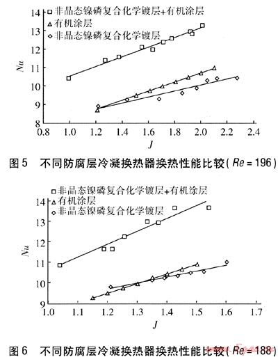 ③ 有機(jī)涂層冷凝換熱器換熱能力在船大時(shí),高于非晶態(tài)鎳磷復(fù)合化學(xué)鍍層冷凝換熱器,是由于有機(jī)涂層可使煙氣在其表面趨于珠狀凝結(jié),改善換熱;在Re小時(shí),換熱能力低于非晶態(tài)鎳磷復(fù)合化學(xué)鍍層冷凝換熱器,是由于形成的液珠在換熱器肋片間搭液橋,使得有機(jī)涂層換熱器換熱能力較低;在Re由大到小的過程中,兩者的換熱能力相差不大,J越大,有機(jī)涂層冷凝換熱器換熱能力越強(qiáng),回收的潛熱量越多。