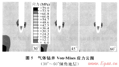 橫向比較分析不同傾角地層氣體鉆井和鉆井液鉆井的Von-Mises應(yīng)力變化趨勢(shì),由圖3、圖4、圖5、圖6綜合分析可見:氣體鉆井井壁巖石在井底附近出現(xiàn)應(yīng)力集中,比鉆井液鉆井井壁巖石應(yīng)力值大,而且等值應(yīng)力分布面積更大,氣體鉆井比鉆井液鉆井更容易出現(xiàn)井壁不穩(wěn)定現(xiàn)象。氣體鉆井井底巖石相同等值線應(yīng)力區(qū)域面積較鉆井液鉆井應(yīng)力區(qū)域更深,巖石破壞范圍要大于鉆井液鉆井的破壞范圍,大大提高了破壞巖石效率和鉆井速度。在相同條件下,如果井眼軌跡發(fā)生偏斜,由于氣體鉆井具有較好的破巖效率,產(chǎn)生井斜可能性和幅度都更大。