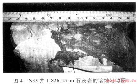 碳酸鹽巖是一種化學性較活潑的巖石,具有可溶蝕性,而且基本上貫穿其成巖作用的各個階段,只是溶蝕強度有明顯差異。該成巖作用常常導致孔、洞的大量發(fā)育,對改善儲層的儲集性能具有非常積極的意義。如南33井1826.27m奧陶系下馬家溝組巖心表面見有方解石充填物的溶蝕孔洞,洞徑約3×6mm,肉紅色石灰?guī)r邊緣還見溶蝕形成的港灣狀(見圖4)。