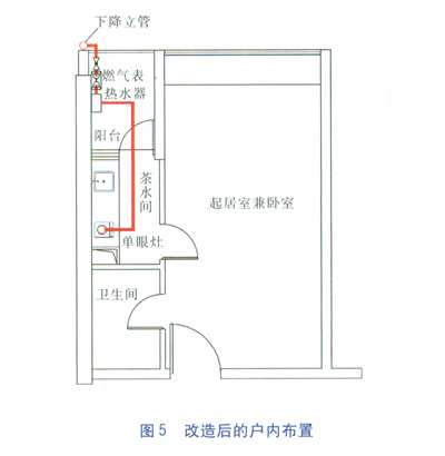 由于業(yè)主強(qiáng)烈要求不僅熱水器要供燃?xì)?,茶水間內(nèi)的單眼灶也需要用燃?xì)?。因此,我們考慮了規(guī)范的要求,茶水間作為廚房用時(shí),在茶水間與起居室兼臥室間增設(shè)實(shí)體墻和門(mén),使茶水間與起居室得到有效隔離,并要求業(yè)主選用帶有自動(dòng)熄火保護(hù)裝置的燃?xì)庠?,這樣就滿(mǎn)足用氣條件。燃?xì)獗砗笕細(xì)夤艿揽梢圆捎勉~管直埋于墻壁,并分兩路,一路在墻壁敷設(shè)引進(jìn)熱水器,另一路沿墻壁下來(lái)直接進(jìn)入地板內(nèi)敷設(shè),從而連接單眼灶。這樣熱水器和單眼灶都能使用燃?xì)狻8脑旌蟮膽?hù)內(nèi)布置見(jiàn)圖5。