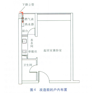 舉例:有一公寓戶(hù)型,茶水間作為廚房用,布置有煙道、單眼灶和洗手盆,并與起居室兼臥室相連。由于此戶(hù)型衛(wèi)生間是暗室,因此,熱水器只能安裝在陽(yáng)臺(tái)上,燃?xì)饬⒐馨惭b在陽(yáng)臺(tái)外側(cè),燃?xì)獗戆惭b在陽(yáng)臺(tái)上,表前燃?xì)夤艿姥貕芸辗笤O(shè),表后燃?xì)夤艿啦捎勉~管直埋于墻壁,并引至熱水器。GB 50028—2006第10.4.2條規(guī)定,居民生活用氣設(shè)備嚴(yán)禁設(shè)置在臥室內(nèi)。因此,此戶(hù)型的茶水間不具備用氣條件,原設(shè)計(jì)時(shí)我們也沒(méi)有將燃?xì)夤艿酪氩杷g,而只供熱水器使用燃?xì)?。改造前的?hù)內(nèi)布置見(jiàn)圖4。