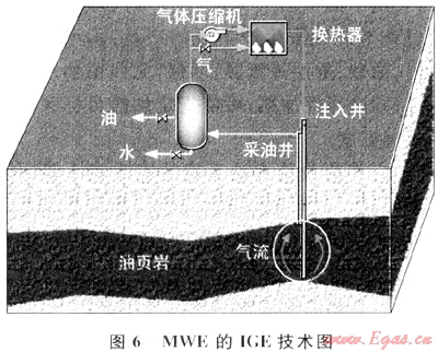 工藝流程:先將高溫蒸汽注入油頁(yè)巖地層中,對(duì)流加熱油頁(yè)巖,與油頁(yè)巖換熱后,把熱解生成的油氣載到地面上來(lái),冷凝、回收。分離后的不凝氣被加熱到一定溫度后通入到地層與油頁(yè)巖換熱,循環(huán)利用(圖6)。MWE公司稱,該工藝中1口井的覆蓋面積可達(dá)3000m2,產(chǎn)油超過(guò)8100t/a[12]。