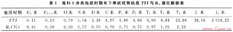 根據(jù)高科1井的沉積埋藏史圖(圖4)可見,樂山-龍女寺古隆起區(qū)下寒武統(tǒng)源巖經(jīng)歷了埋藏-抬升(剝蝕)-再埋藏-再抬升的演化過程。其有機(jī)質(zhì)生烴史可分為三期:第一期為初始生烴階段:高科1井下寒武統(tǒng)源巖在志留紀(jì)末R。值已達(dá)0.7%,處于未成熟一低成熟生烴期;第二期為生烴停滯階段,由于加里東運(yùn)動(dòng)的抬升作用,該井下寒武統(tǒng)源巖埋深變淺并遭受剝蝕,古地溫降低,有機(jī)質(zhì)進(jìn)入生烴滯流階段;第三期為“二次生烴”階段:從二疊系開始至二疊系末,下寒武統(tǒng)源巖埋藏深度及其所具有的古地溫已超過了初始生烴階段,源巖進(jìn)入了二次生烴階段。此時(shí),高科1井毛。源巖Ro值已達(dá)0.71%,有機(jī)質(zhì)開始繼續(xù)生烴。印支末期,高科1井