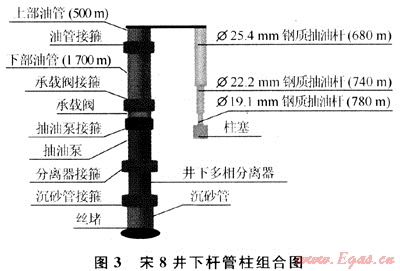 該井井下配套裝置采用前述Ф44mm防腐防氣整筒式金屬柱塞泵、組合式井下高效多相分離器、承載閥裝置。井下桿管柱結(jié)構(gòu)經(jīng)過優(yōu)化設(shè)計(jì),在現(xiàn)有抽油機(jī)條件下,采用Ф25.4mm×820m+Ф22.2mm×800m+Ф19.1mm×700m的D級抽油桿方案(圖3)。但由于機(jī)抽井少,桿柱調(diào)節(jié)困難,仍采用原井桿柱(即泵掛2200m),且由于配套抽油桿短節(jié)缺失,上部Ф25.4mm抽油桿與光桿之間采用臨時加工的普通平扣短節(jié)代替。