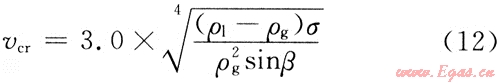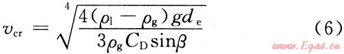 將式(8)的de代入式(6),則攜帶最大液滴的最小氣體流速為: