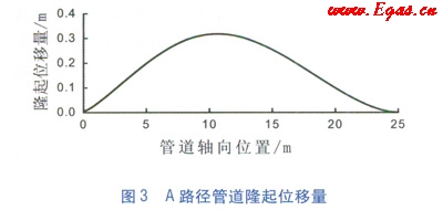A路徑上各點(diǎn)的垂直方向隆起位移量見圖3(其中A點(diǎn)為坐標(biāo)原點(diǎn),C點(diǎn)位于管道軸向位置25m處),可見管道受滑坡體作用發(fā)生隆起,且最大隆起位移位于管道中下部,即B點(diǎn)偏下位置,這是因?yàn)楣艿老路绞艿降耐馏w壓力比上方大引起的。