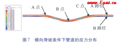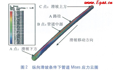 模型中滑坡體取粘土,土體剪切強(qiáng)度為50kPa,滑坡傾斜角為30°,滑坡規(guī)模為25m。以輸油管道為例,管道外徑為711mm,壁厚為10.3mm,管道材質(zhì)為X70鋼,管道內(nèi)壓8MPa,管道埋深1.8m,管—土間的摩擦系數(shù)為0.65。在ABAQUS軟件中繪制出管道的Mises應(yīng)力云圖(見圖2,單位為MPa),并沿管道軸向在管道上取A點(diǎn)、B點(diǎn)、C點(diǎn)和經(jīng)過以上三點(diǎn)的A路徑為參考位置和分析對象。