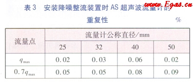 據(jù)國(guó)家質(zhì)量監(jiān)督檢驗(yàn)檢疫總局發(fā)布的超聲波標(biāo)準(zhǔn)JJG 1030—2007《超聲流量計(jì)》的要求,的重復(fù)性不能超過(guò)相應(yīng)準(zhǔn)確度等級(jí)規(guī)定的最相對(duì)誤差絕對(duì)值的1/5,即作為1.5級(jí)的AS流量計(jì)的重復(fù)性,除分界流量點(diǎn)(qt)以下的應(yīng)滿(mǎn)足重復(fù)性≤0.6%外,其他流量點(diǎn)應(yīng)滿(mǎn)足≤0.3%。流量計(jì)的重復(fù)性越小,性能越好。析表3和表4中的數(shù)據(jù),安裝降噪整流裝置的As超聲波流量計(jì)的重復(fù)性比不安裝降噪整流裝置的超聲波流量計(jì)的重復(fù)性要小很多,達(dá)到0.5級(jí)AS超聲波流量計(jì)的重復(fù)性的要求。試驗(yàn)證明降噪整流裝置的整流效果在超聲波流量計(jì)的重復(fù)性方面也能體現(xiàn)。