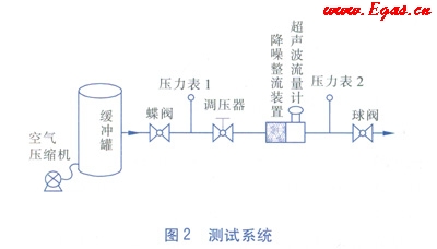 試驗(yàn)中,用來(lái)產(chǎn)生超聲波噪聲的設(shè)備是調(diào)壓器。在氣體流動(dòng)的過(guò)程中,調(diào)壓器兩側(cè)的壓力差越大所產(chǎn)生的超聲波噪聲越大。本測(cè)試的方法是:在一個(gè)容積為5m3的緩沖罐中充入空氣,使其內(nèi)部達(dá)到500kPa左右的絕對(duì)壓力,緩沖罐的一側(cè)接有DN 50mm的管道,管道上依次接有蝶閥、壓力表1、調(diào)壓器、降噪整流裝置、AS超聲波流量計(jì)、壓力表2和球閥。為了模擬實(shí)際使用現(xiàn)場(chǎng),特約束了它們之間的距離。蝶閥與壓力表1相距10D(D為管道公稱(chēng)直徑),壓力表1與調(diào)壓器相距15D,調(diào)壓器與降噪整流裝置相距5D,降噪整流裝置與AS超聲波流量計(jì)直接連接,超聲波流量計(jì)與壓力表2相距10D,壓力表2與球閥相距10D,測(cè)試系統(tǒng)見(jiàn)圖2。選用的AS超聲波流量計(jì)規(guī)格為DN 50mm,始動(dòng)流量為0.37m3/h,流量范圍為3~150m3/h。