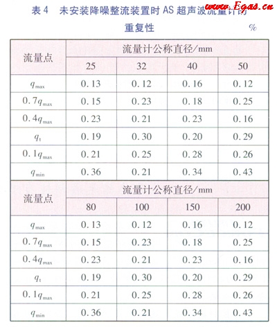 為了使得試驗(yàn)結(jié)果更具有對(duì)比性,把各個(gè)口徑的AS超聲波流量計(jì)拆下降噪整流裝置后按照所校驗(yàn)流量點(diǎn)進(jìn)行檢定,并統(tǒng)計(jì)各個(gè)流量點(diǎn)的重復(fù)性,見(jiàn)表4。