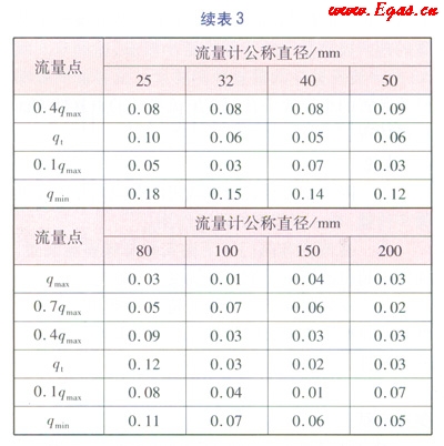 試驗(yàn)的方法為:在標(biāo)準(zhǔn)表校驗(yàn)裝置上被檢表的位置安裝好待測(cè)的儀器后,按照校驗(yàn)流量計(jì)的方法分別對(duì)qmin、0.1qmax、qt、0.4qmax、0.7qmax和qmax的流量點(diǎn)進(jìn)行校驗(yàn)。qmin為流量計(jì)的標(biāo)稱(chēng)最小流量;qmax為流量計(jì)的標(biāo)稱(chēng)最大流量;qt為分界流量,即流量范圍被分割成“高區(qū)”和“低區(qū)”的分界點(diǎn)的流量,“高區(qū)”的準(zhǔn)確度等級(jí)為流量計(jì)的標(biāo)稱(chēng)準(zhǔn)確度等級(jí),“低區(qū)”的準(zhǔn)確度等級(jí)為流量計(jì)的標(biāo)稱(chēng)準(zhǔn)確度等級(jí)的2倍。