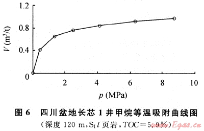 圖6為長芯1井120m處所取巖心的等溫吸附曲線(70℃等溫),該樣品為志留系龍馬溪組黑色頁巖,有機碳含量為5.9%,成熟度為3.26%。在70℃等溫條件下,隨著壓力增高,頁巖吸附甲烷的能力(V)逐漸增大,在壓力達到8.5MPa時,頁巖的甲烷吸附能力達到1m3/t。通過與美國5大頁巖氣盆地的頁巖等溫吸附曲線對比可以發(fā)現,長芯1井志留系頁巖的吸附能力除與圣胡安盆地白堊系Lewis頁巖相近外,均低于其他盆地的頁巖。究其原因,筆者認為很可能與成熟度有關。目前發(fā)現的進行商業(yè)開發(fā)的美國5大頁巖氣盆地的頁巖,成熟度普遍不高,介于0.4%~1.9%之間。而熱成因的頁巖氣藏,頁巖成熟度較高,大多在1.1%以上,最高不超過3%。四川盆地長芯1井志留系頁巖的成熟度過高,Ro達到了3.26%,已進入過成熟階段,這可能是導致其吸附能力較低的主要原因。另仔細分析可以發(fā)現,美國5大頁巖氣盆地中圣胡安盆地白堊系Lewis頁巖的成熟度最高,為1.6%~1.88%,其頁巖的吸附能力則最小。