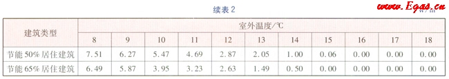 根據(jù)文獻[1]及GB 50736—2012《民用建筑供暖通風與空氣調(diào)節(jié)設計規(guī)范》、JCJ 26—2010《嚴寒和寒冷地區(qū)民用建筑節(jié)能設計標準》、JGJ 26—5《民用建筑節(jié)能設計標準(供暖居住建筑部分)》規(guī)定的汁算參數(shù),以烏魯木齊市供熱區(qū)域內(nèi)某居住建筑為例,進行能耗分析。該建筑坐北朝南,共6層,建筑高度為16.8m,總建筑面積為4112.64m2,體形系數(shù)為0.28。節(jié)能50%居住建筑外墻傳熱系數(shù)為0.43W/(m2·K),外窗的傳熱系數(shù)為2.47W/(m2·K);節(jié)能65%居住建筑外墻傳熱系數(shù)為0.35W/(m2·K),外窗傳熱系數(shù)為1.8W/(m2·K)。計算得出不同室外溫度(室外溫度取整數(shù))時,該居住建筑分別節(jié)能65%、50%時的供暖熱負荷指標,計算結(jié)果見表2。當室外溫度達到16℃時,鍋爐停止供暖,熱負荷指標為0,但由于烏魯木齊的晝夜溫差可逾20℃,因此存在白天停止供暖,傍晚及夜間又恢復供暖的情況。