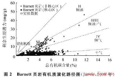 需要注意:初始有機質(zhì)豐度較高的烴源巖,隨著熱演化程度加深,生烴量增加,殘余有機碳豐度、氫指數(shù)、有機質(zhì)類型呈現(xiàn)降低、變差趨勢,如Tmax(最大熱解溫度)432℃、等效成熟度0.62%,Barnett頁巖演化至Tmax為470℃,等效成熟度為1.3%時,TOC數(shù)值可降低36%(圖2),對于高成熟和/或過成熟烴源巖,負(fù)面影響則更大,所以簡單套用殘余有機碳豐度、氫指數(shù)或于酪根類型判斷頁巖生氣能力的高低可能有失偏頗。但儲集能力而言,殘余有機質(zhì)豐度??杀碚骱瑲饬看笮?,特別是當(dāng)兩者呈現(xiàn)正相關(guān)情況下。北美頁巖氣勘探目標(biāo)絕大多數(shù)選擇TOC含量大于2%,甚至4%以上,與此有關(guān)聯(lián)。因此資源潛力評價過程中應(yīng)綜合考量有機質(zhì)豐度指標(biāo),既要重視源巖原始有機質(zhì)豐度與生烴潛力,又要關(guān)注頁巖儲層殘余總有機碳含量的作用。