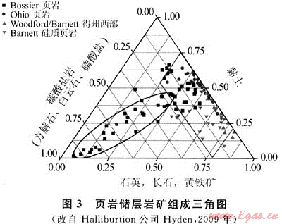 裂縫發(fā)育受內(nèi)、外因控制。外因主要與生烴過程、地層孔隙壓力、各向異性的水平壓力、斷層與褶皺等構(gòu)造作用相關(guān),內(nèi)因主要取決于頁巖礦物學(xué)特征。圖3展示了已開發(fā)頁巖的兩個分布區(qū)域:Bossier頁巖大都位于石英、長石和黃鐵礦含量低于40%,碳酸鹽巖含量大于25%,黏土礦物低于50%區(qū)間;Ohio、Woodford/Barnett頁巖位于碳酸鹽含量低于25%,石英、長石和黃鐵礦含量20%~80%,黏土含量在20%~80%區(qū)間,其中Barnett硅質(zhì)頁巖黏土礦物通常小于50%,石英等含量超過40%,Arkoma盆地Woodford頁巖與其相近。即頁巖膨脹性黏土礦物含量較少,硅質(zhì)、碳酸鹽巖等礦物較多時(Fort Worth盆地Barnett頁巖典型值為40%~60%),巖石脆性與造縫能力強,裂縫網(wǎng)絡(luò)容易產(chǎn)生。