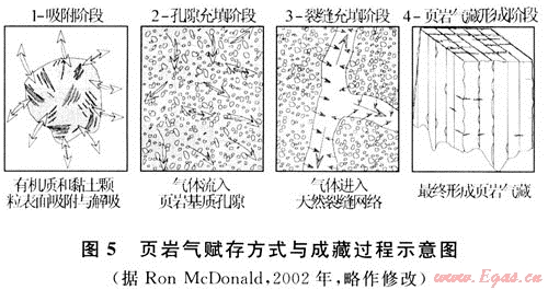 頁巖氣藏中氣體的賦存形式多種多樣,其中絕大部分是以吸附氣的形式賦存于頁巖內(nèi)有機(jī)質(zhì)和黏土顆粒的表面,這與煤層氣相似。吸附氣量與有機(jī)碳含量、地層壓力等因素有關(guān)。游離氣則聚集在頁巖基質(zhì)孔隙或裂縫(主要為微裂縫)中,這與常規(guī)氣藏中的天然氣相似。此外,可能還有極少部分頁巖氣以溶解氣形式存在于頁巖孔隙束縛水或?yàn)r青中。因此,頁巖氣的形成機(jī)理兼具煤層吸附氣和常規(guī)天然氣兩者特征,為不間斷充注、連續(xù)聚集成藏(圖5)。在頁巖氣成藏過程中,隨天然氣富集量增加,其賦存方式發(fā)生改變,完整的頁巖氣藏充注與成藏過程可分為4個(gè)階段[4]。第一階段為天然氣生成與吸附階段,該階段形成的頁巖氣藏具有與煤層氣相似的成藏機(jī)理;第二階段為吸附氣量(包括部分溶解氣量)達(dá)到飽和時(shí),富余氣體解吸或直接充注到頁巖基質(zhì)孔隙中(也不排除少量直接進(jìn)入了微裂縫中),其富集機(jī)理類似于孔隙型儲(chǔ)層中天然氣的聚集;第三階段是隨著大量氣體的生成,頁巖基質(zhì)孔隙內(nèi)溫度、壓力升高,出現(xiàn)巖石造縫以及天然氣以游離狀態(tài)進(jìn)入頁巖裂縫中成藏;經(jīng)過前述三個(gè)過程后,天然氣最終以吸附氣和游離氣的形式富集形成頁巖氣藏,即頁巖氣藏形成階段。