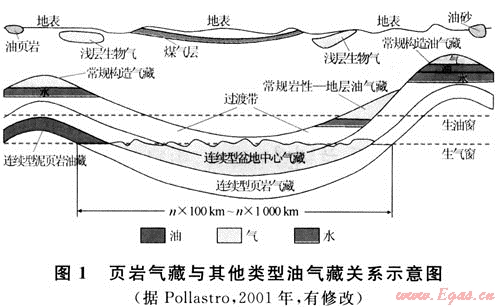 2) 無明顯圈閉:傳統(tǒng)上的常規(guī)油氣均聚集在圈閉中,圈閉是油氣藏形成的基礎(chǔ),決定著油氣藏的基本特征以及勘探方法。頁巖氣藏雖在字面上還稱之為藏,實(shí)則沒有藏的邊界,即頁巖氣不是聚集在某個(gè)圈閉中成藏的,而是包含盆地中已經(jīng)進(jìn)入生氣窗范圍內(nèi)的所有烴源巖中皆可成藏(圖1)。常規(guī)油氣藏,即使是巖性油氣藏,都是在一定的構(gòu)造背景下形成的,而頁巖氣藏不受構(gòu)造因素的控制。