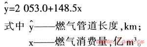 管道長度的增加是管網(wǎng)改造的主要成本之一,只有用管線總長度最小的管網(wǎng)銷售最大的用氣量,才能得到最高的系統(tǒng)利用效率。北京市天然氣用量近年來增長很大,負(fù)荷的增加與管網(wǎng)建設(shè)存在一定關(guān)聯(lián),通過對(duì)1995年—2008年間北京市天然氣管線長度與天然氣消費(fèi)量的變化進(jìn)行分析,得出如下的回歸方程: