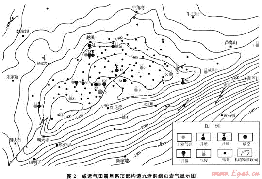 前已述及,威遠(yuǎn)氣田鉆穿下寒武統(tǒng)九老洞組的107口井中,有29口井在九老洞組頁巖中的不同井段出現(xiàn)了不同級別的天然氣顯示,筆者將這些顯示井分別標(biāo)注在威遠(yuǎn)氣田震旦系頂面構(gòu)造圖上(圖2)。由圖可見,九老洞組頁巖氣顯示井的平面分布及顯示特點與下伏震旦系氣井的分布控制因素完全不同。九老洞組頁巖中的氣顯示井不僅在構(gòu)造的軸部、翼部及氣水邊界內(nèi)有分布,尤其值得注意的是在該氣田氣水邊界外的東、西、南、北各個方向均有顯示井分布。如威遠(yuǎn)構(gòu)造西南的威18井已遠(yuǎn)離威遠(yuǎn)氣田的氣水邊界達(dá)16km,但在九老洞組的中部和下部還是出現(xiàn)了3個強(qiáng)烈的氣顯示井段(兩個氣顯示段達(dá)井涌、1段為氣侵)。其中3361.5~3363.5m顯示段,在鉆井過程中放空0.3m,并發(fā)生井涌。氣測全烴由55%增至100%,泥漿噴出轉(zhuǎn)盤面0.5m,氣侵、井涌猛烈,且持續(xù)井涌時間長達(dá)2a。