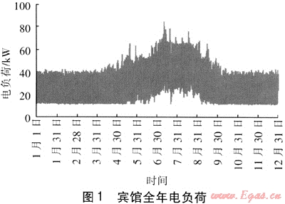 賓館的電負荷具有季節(jié)性特點,夏季電負荷明顯高于冬季。賓館冬季典型日電負荷比較穩(wěn)定,晚間用電負荷明顯增加;由于使用空調(diào),夏季典型日電負荷比冬季增加近1倍。