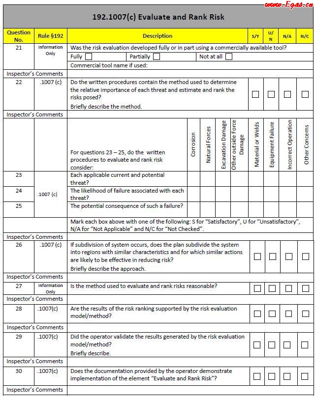 由PHMSA于2011年9月制定和發(fā)布。用于檢查和評(píng)價(jià)燃?xì)膺\(yùn)營企業(yè)開展完整性管理情況,檢查手冊(cè)(示例見圖 5)以表格和提問形式進(jìn)行檢查。對(duì)于問題的回答有S/Y、U/N和N/A三種形式,其中S/Y表示是或者滿足條件,U/N表示不是或者不滿足條件,N/A表示標(biāo)準(zhǔn)不適用或者未進(jìn)行檢查。燃?xì)馄髽I(yè)也可利用該檢查手冊(cè)進(jìn)行自檢,以完善其完整性管理水平。
