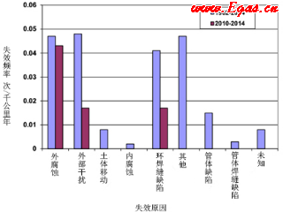 主要失效原因包括外腐蝕、外部干擾和環(huán)焊縫缺陷。管體缺陷和制管焊縫缺陷導(dǎo)致的失效在近5年(2010-2014年)沒有發(fā)生(圖14),這與制管水平的提高有較大關(guān)聯(lián)。