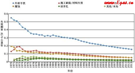 圖9 EGIG管道失效頻率(各因素5年移動平均失效率)