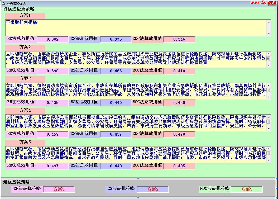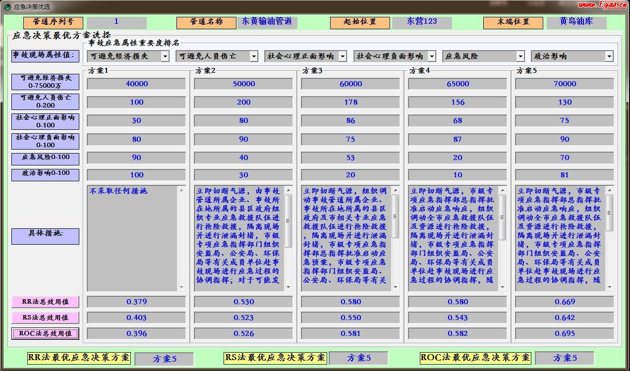(3)通過比較現(xiàn)有預選應急方案的效用值,遴選出最有效的應急方案,使得管道重大事故發(fā)生時的應急方案決策更加科學合理,相關(guān)企業(yè)或政府部門決策更加迅速。系統(tǒng)操作簡單、穩(wěn)定性強,可在城市油氣管道管理企業(yè)中推廣使用。
